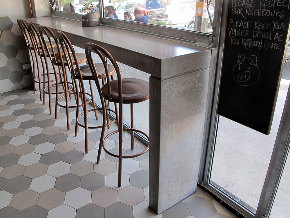 The feature bar is lined with a robust concrete counter, paired with café tables and high tables that balance durability with a refined, minimal finish. As with all our interstate projects, the pieces were precast in Fremantle and transported to New South Wales for installation, ensuring a seamless fit despite the tight programme.