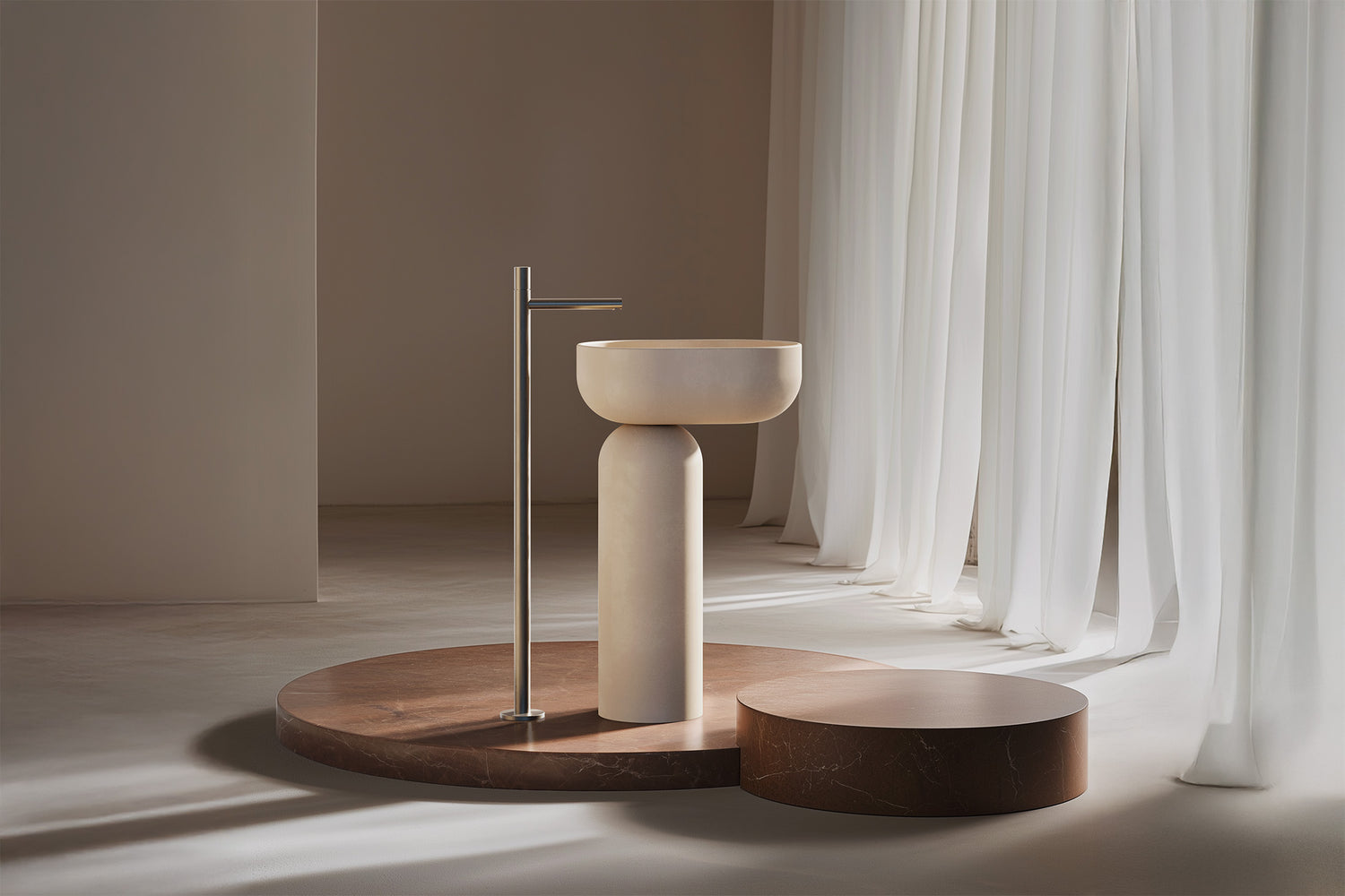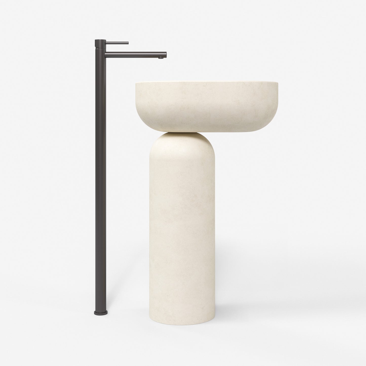 Talaia Pedestal carries this same language into a new context. The pedestal’s offset basin echoes the bold gesture of cantilever, distilled into an elemental form that feels both poised and grounded. It speaks to balance, restraint, and sculptural quietness, creating a statement that is as architectural as it is functional.