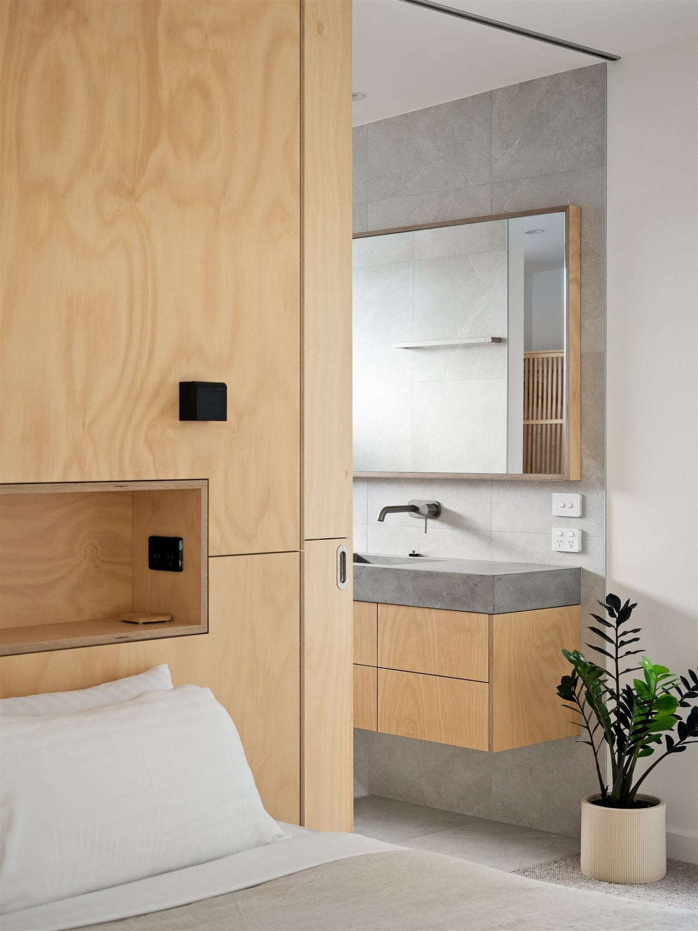 Each piece was handcrafted in GFRC, allowing for refined edges and a slim, controlled profile while maintaining durability for high-use, short-stay accommodation. The finish is smooth and matte, softening the material’s inherent strength and complementing the home’s neutral tones.