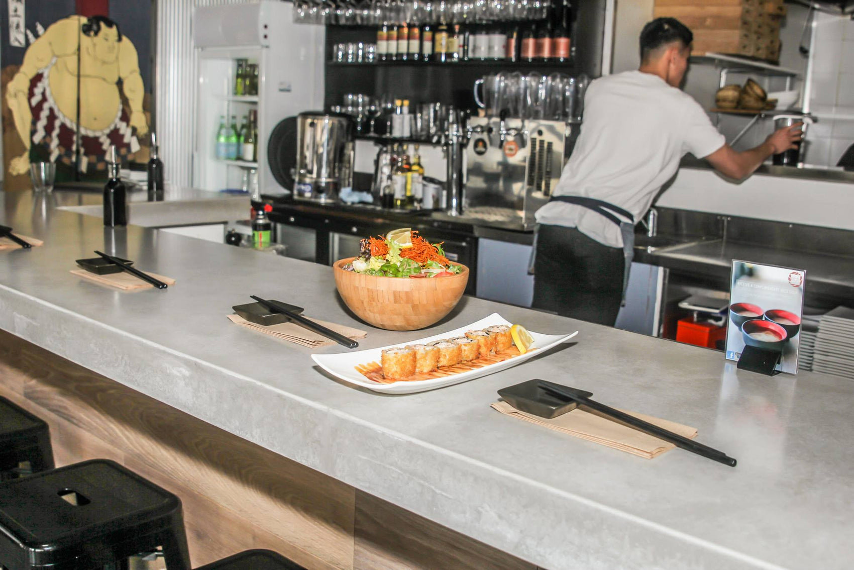 Custom concrete sushi bar. A seamless five-metre installation with one metre returns that anchors the pared-back interior while meeting the demands of daily service.