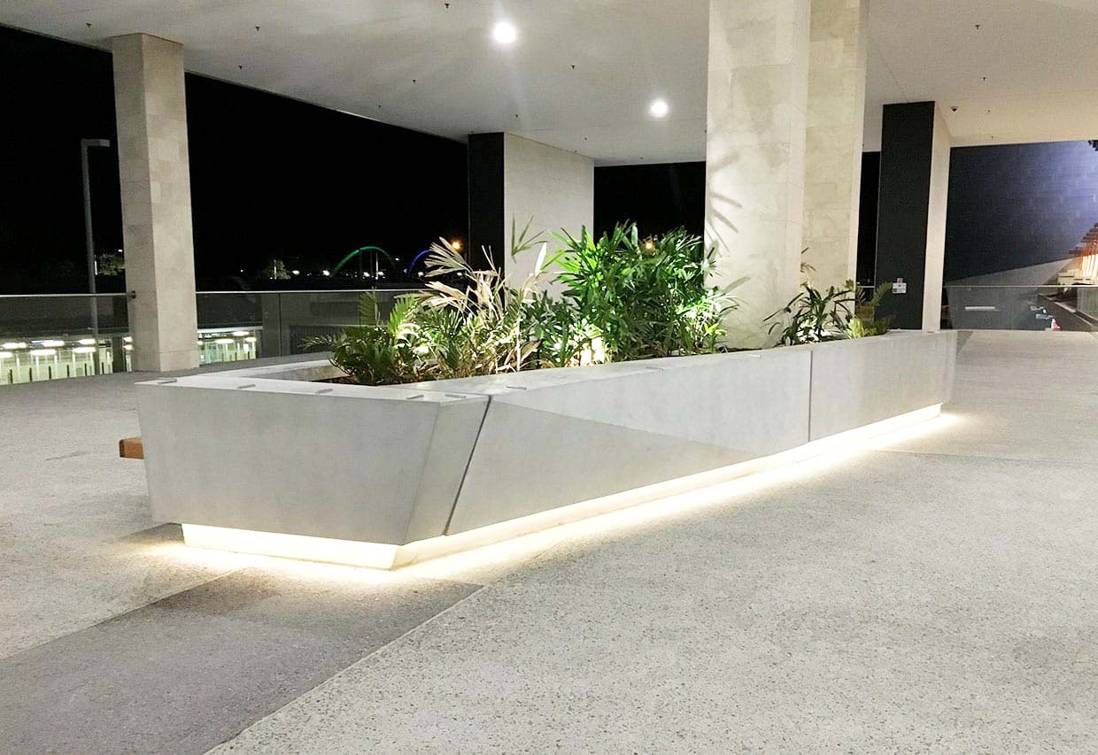 Feature concrete planter and bench seating in GFRC. Angled blocks with integrated lighting transformed a courtyard into an active social space above a busy transport hub.