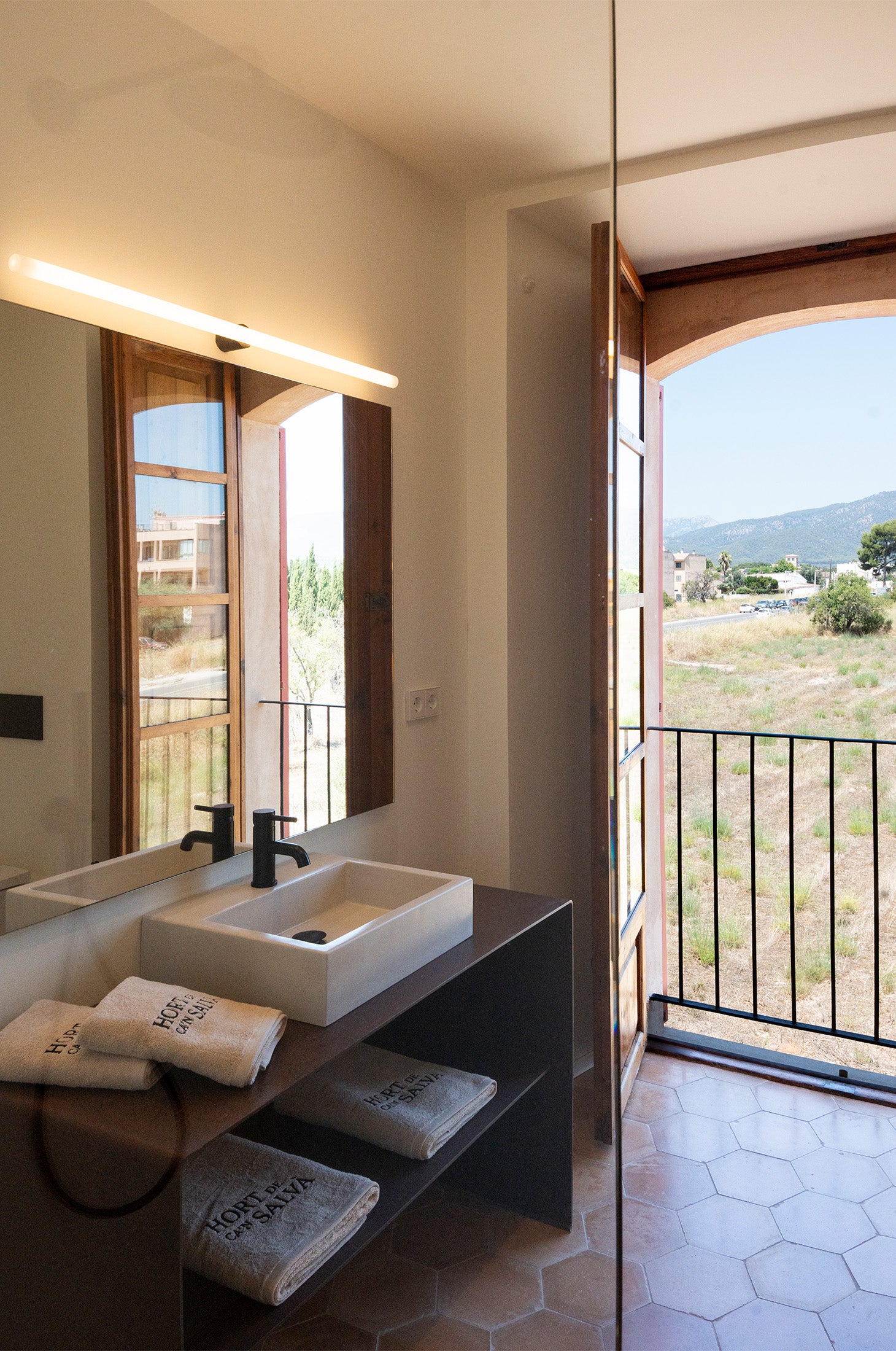 A restored Mallorcan villa nestled in the peaceful countryside of Santa Maria del Camí, where Concrete Studio crafted bespoke concrete bathroom sinks to echo the island’s quiet elegance.