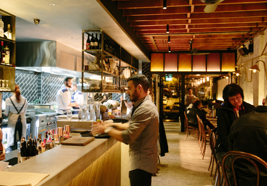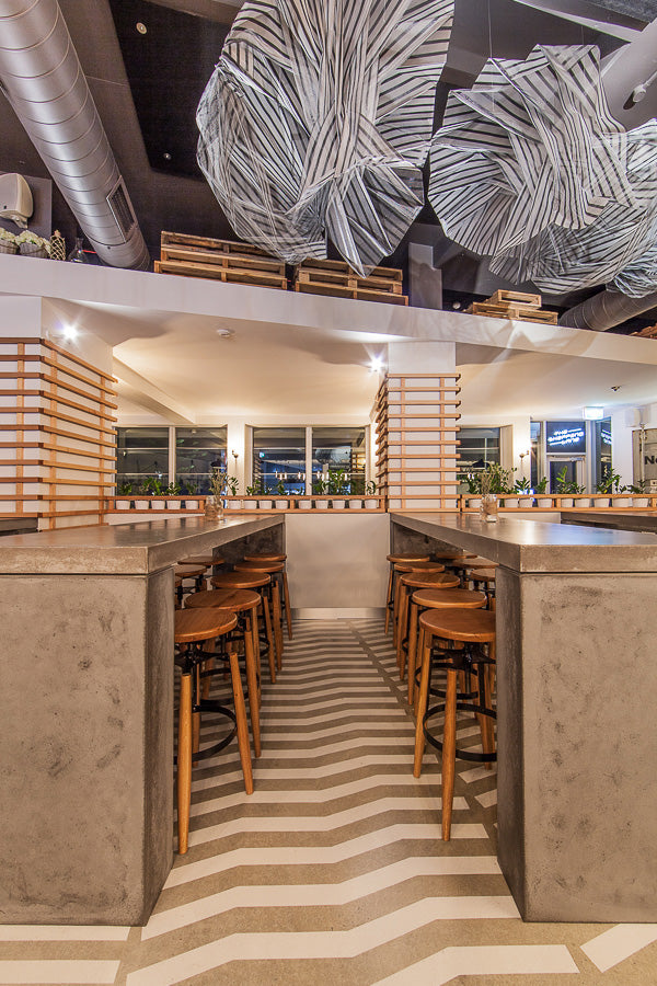 Concrete café counter, sushi bar, and high bar tables for a coastal hospitality venue in Fremantle. Robust yet refined, built for the flow of busy service.