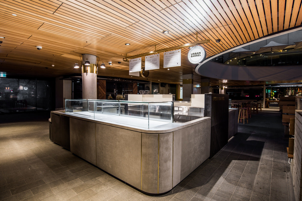 Concrete bar fronts, counters, and panels for Urban Barrel in Sydney. Featuring a curved 90º corner in GFRC, a complex detail delivered with precision.