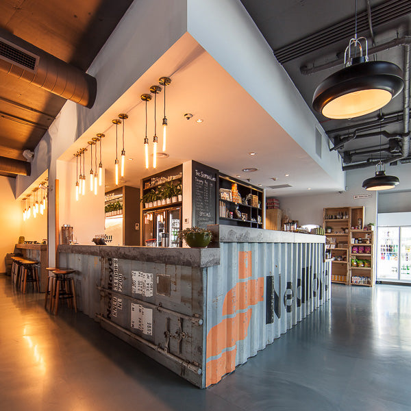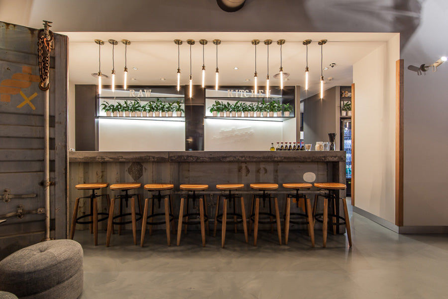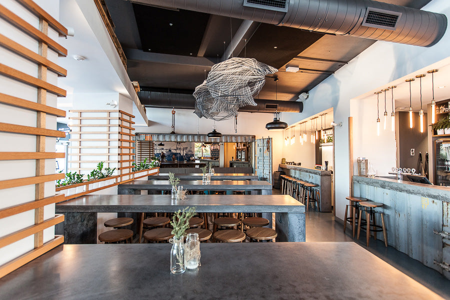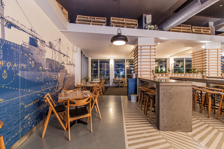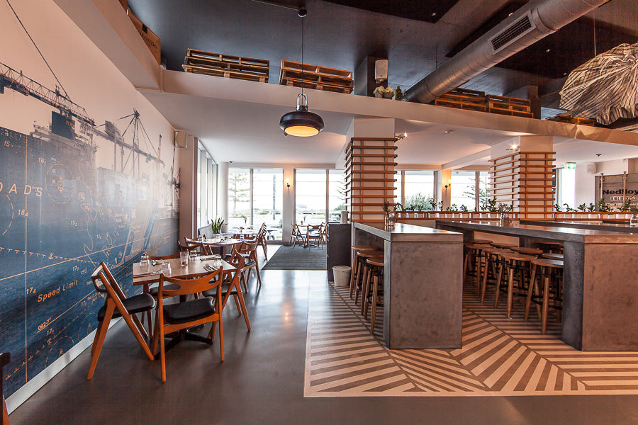 Stiely Design led the interior fit-out, transforming a raw concrete shell into a venue that balances industrial grit with coastal ease. Concrete Studio was invited to fabricate a series of bespoke concrete elements that anchor the design, reinforcing the shipping-container aesthetic while complementing the panoramic ocean views.