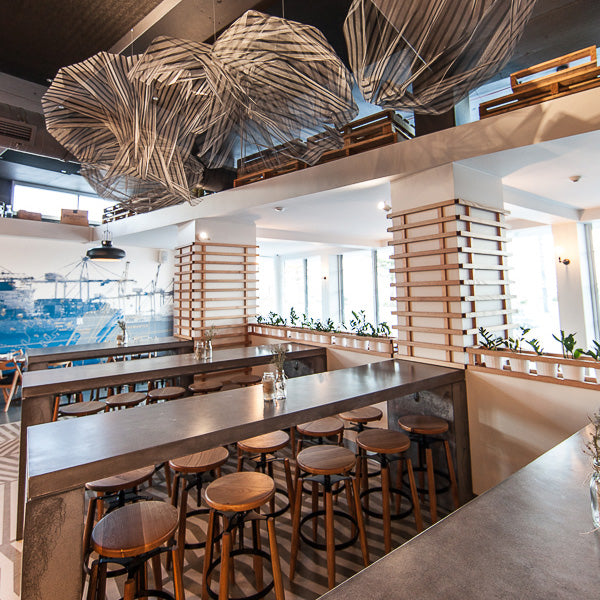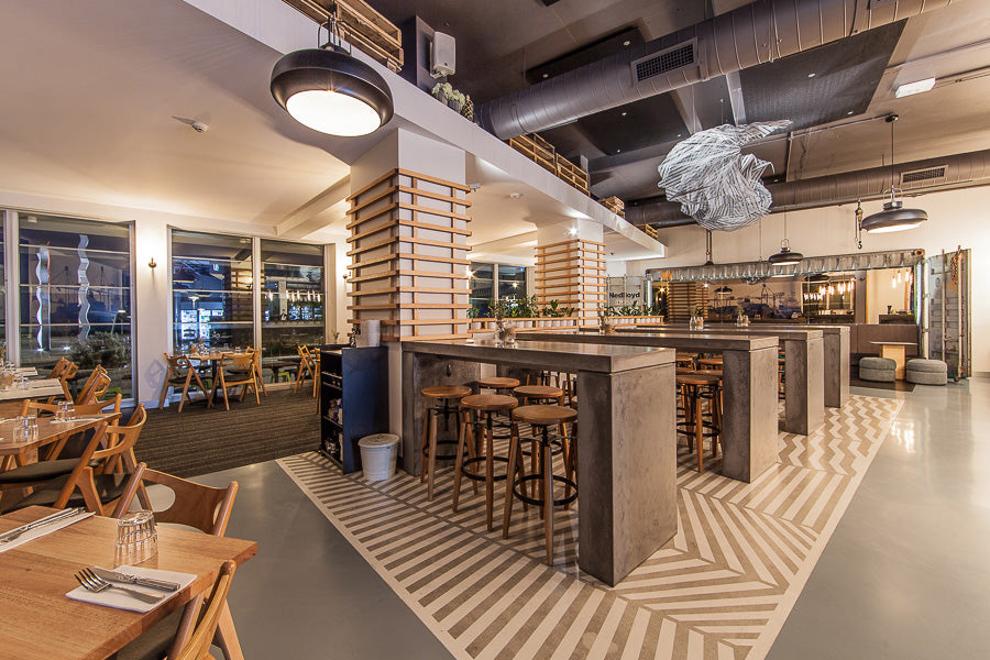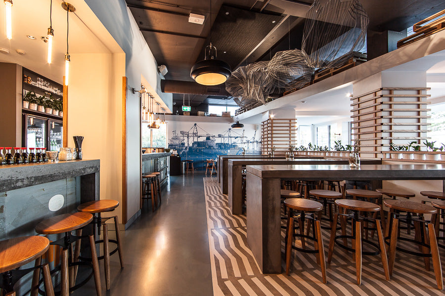 We crafted a robust concrete café counter, a feature sushi bar, and a suite of high bar tables. These pieces provide both durability and presence, hard-wearing surfaces that can endure the rigours of daily service, yet refined enough to suit an upscale hospitality environment.