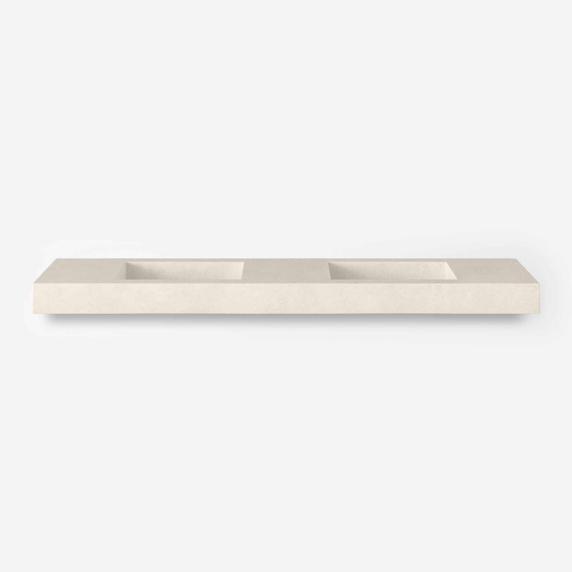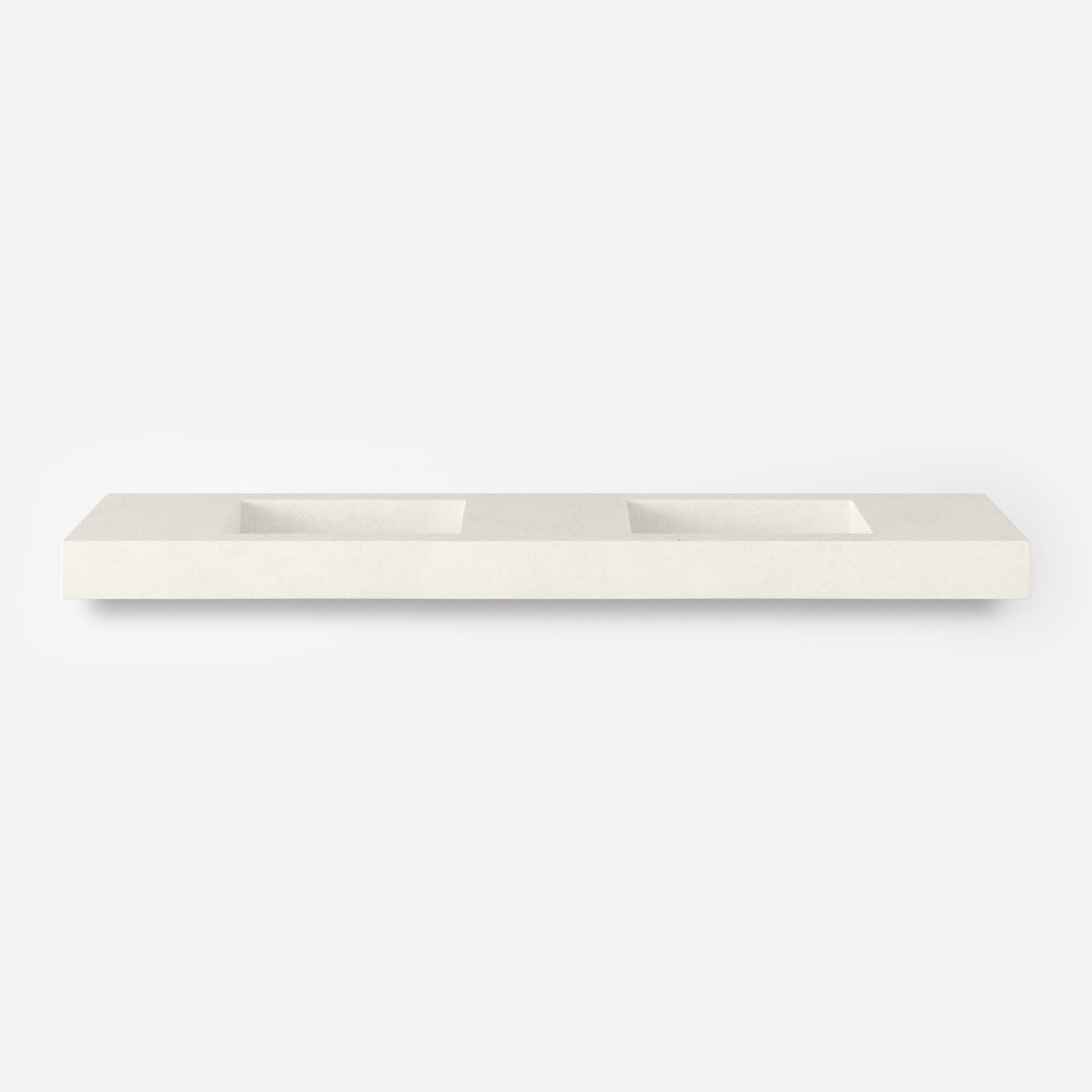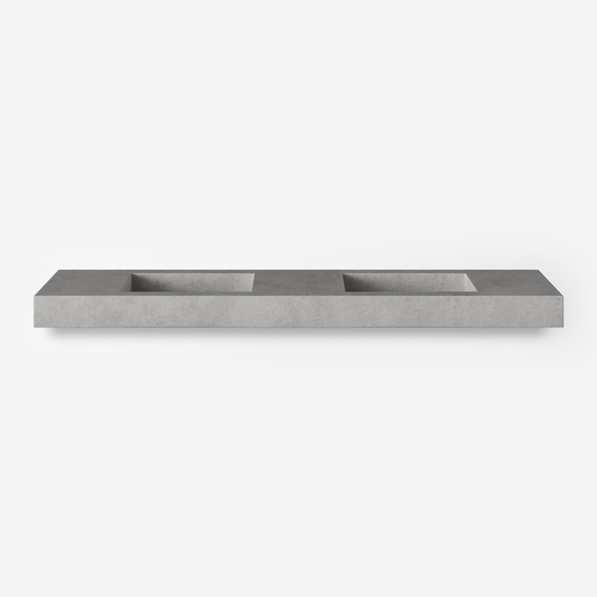 A concrete vanity top integrated with two rectangular basins. This seamless design results in a clean modern look for your bathroom with no basin edges to trap water. Baly vanity tops can be wall mounted (floating) or can be counter mounted onto appropriate cabinetry.