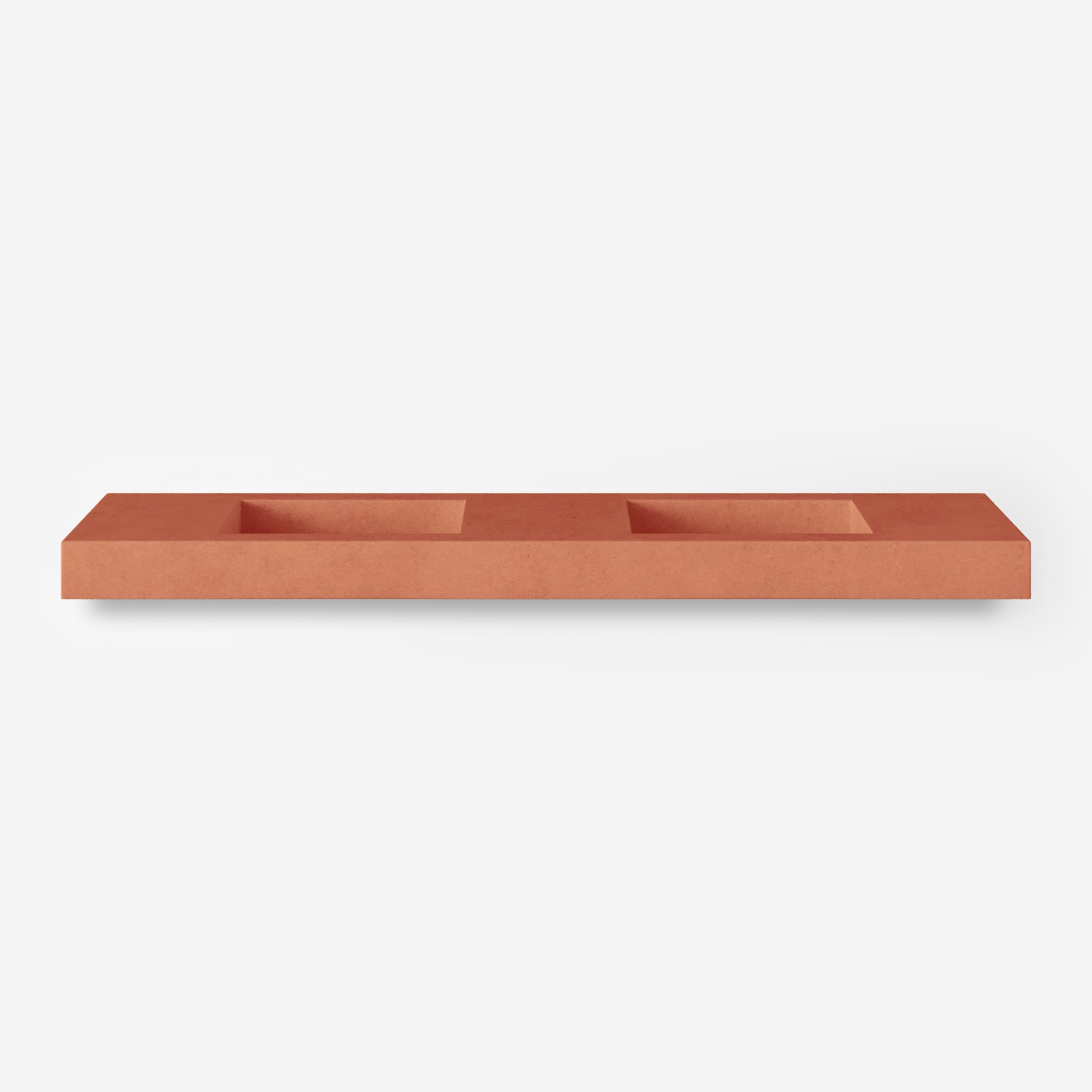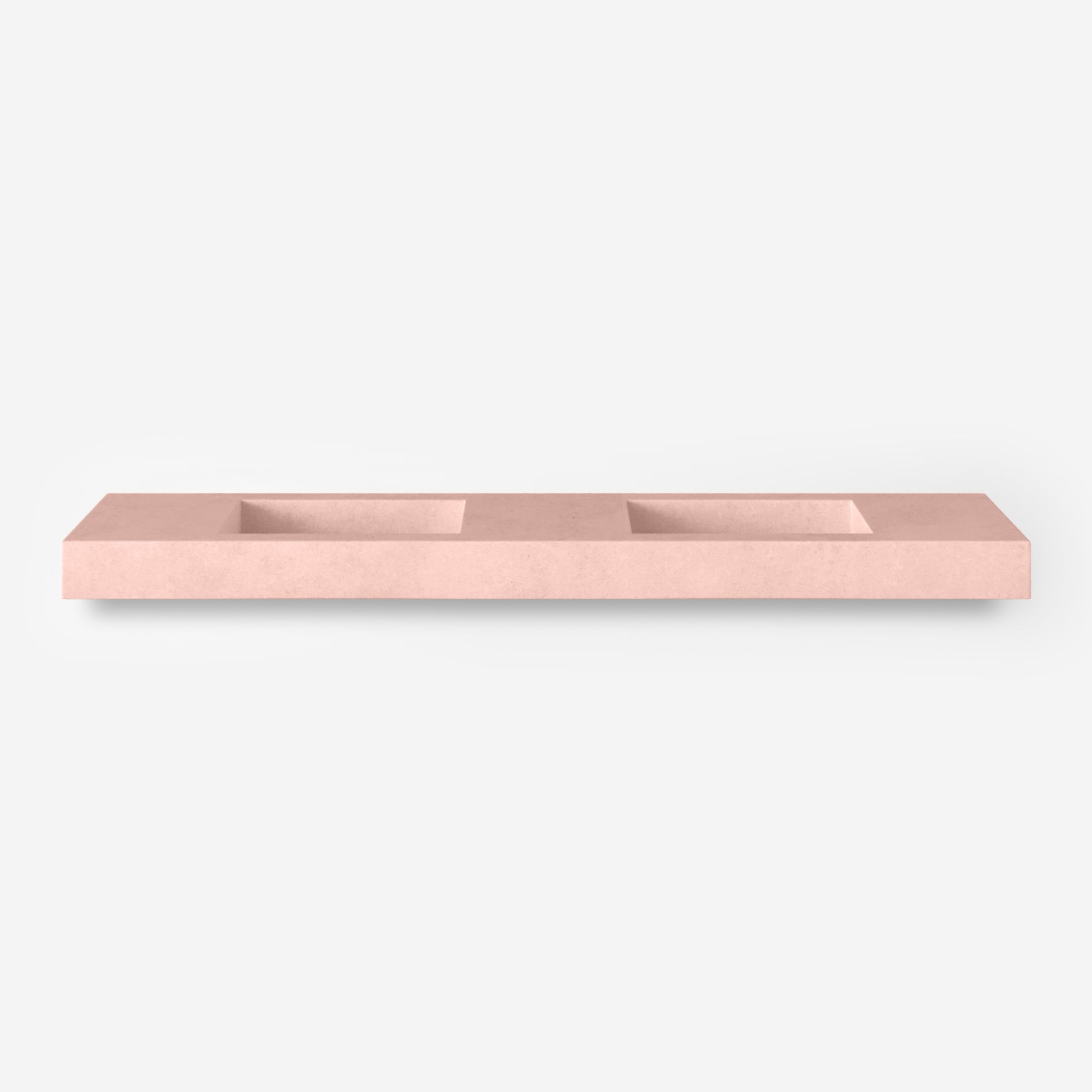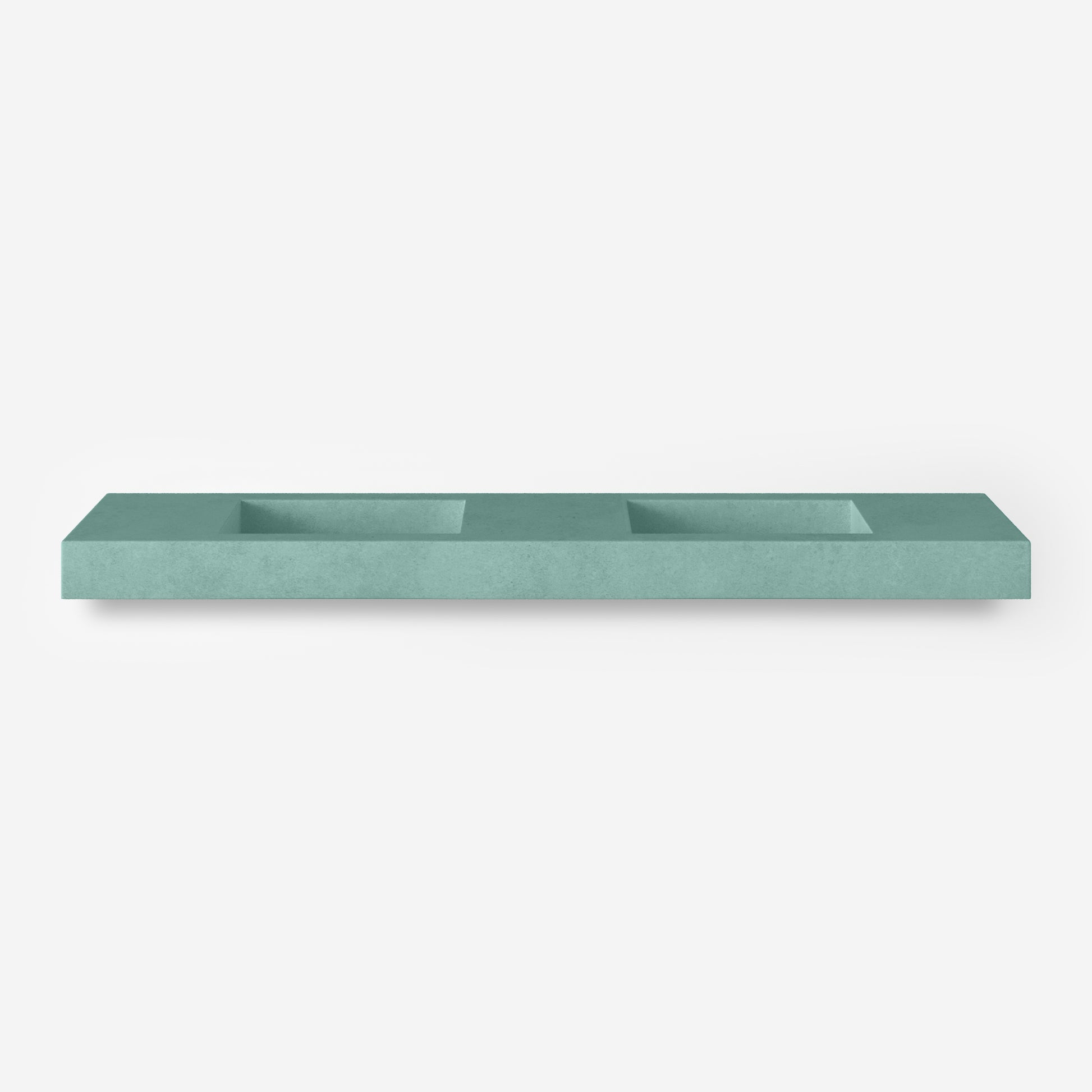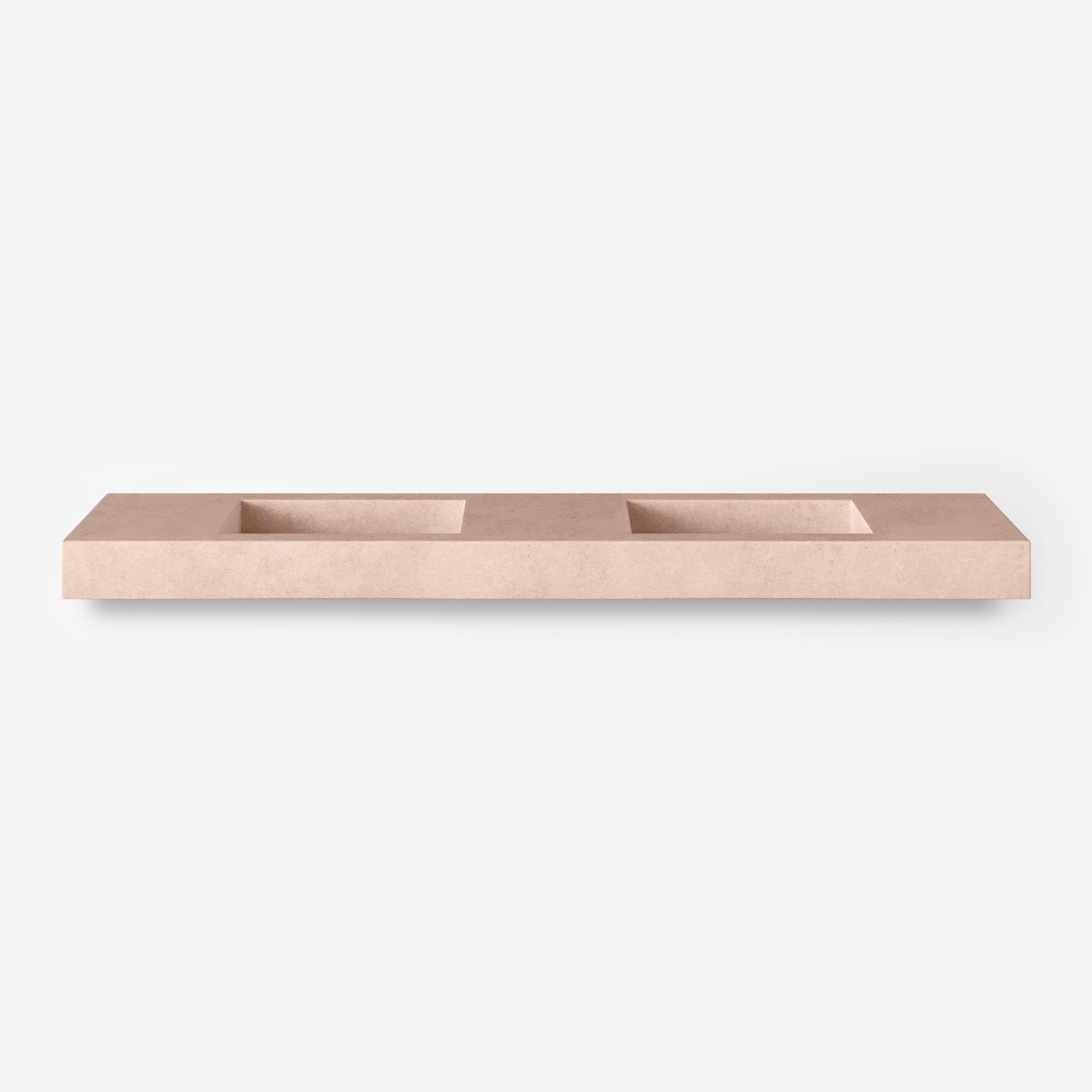 A concrete vanity top integrated with two rectangular basins. This seamless design results in a clean modern look for your bathroom with no basin edges to trap water. Baly vanity tops can be wall mounted (floating) or can be counter mounted onto appropriate cabinetry.