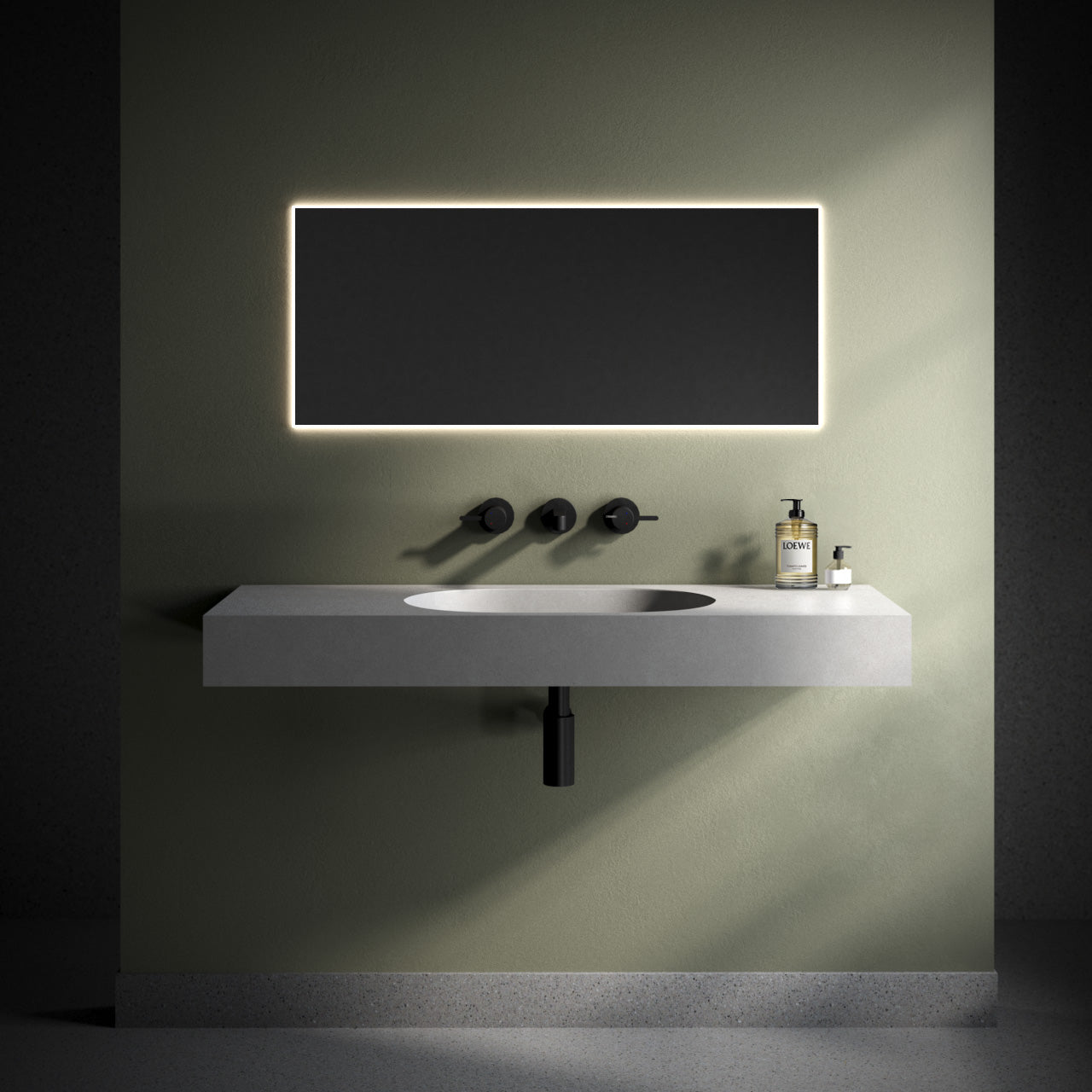A concrete vanity top with a gently extended, river-like basin form. The fluid oblong shape is cast seamlessly into the surface, creating a sculptural centrepiece with no joins or edges to collect water. Designed for versatility, the Bilya vanity can be installed as a floating wall mount or placed onto cabinetry as a counter-mounted feature.