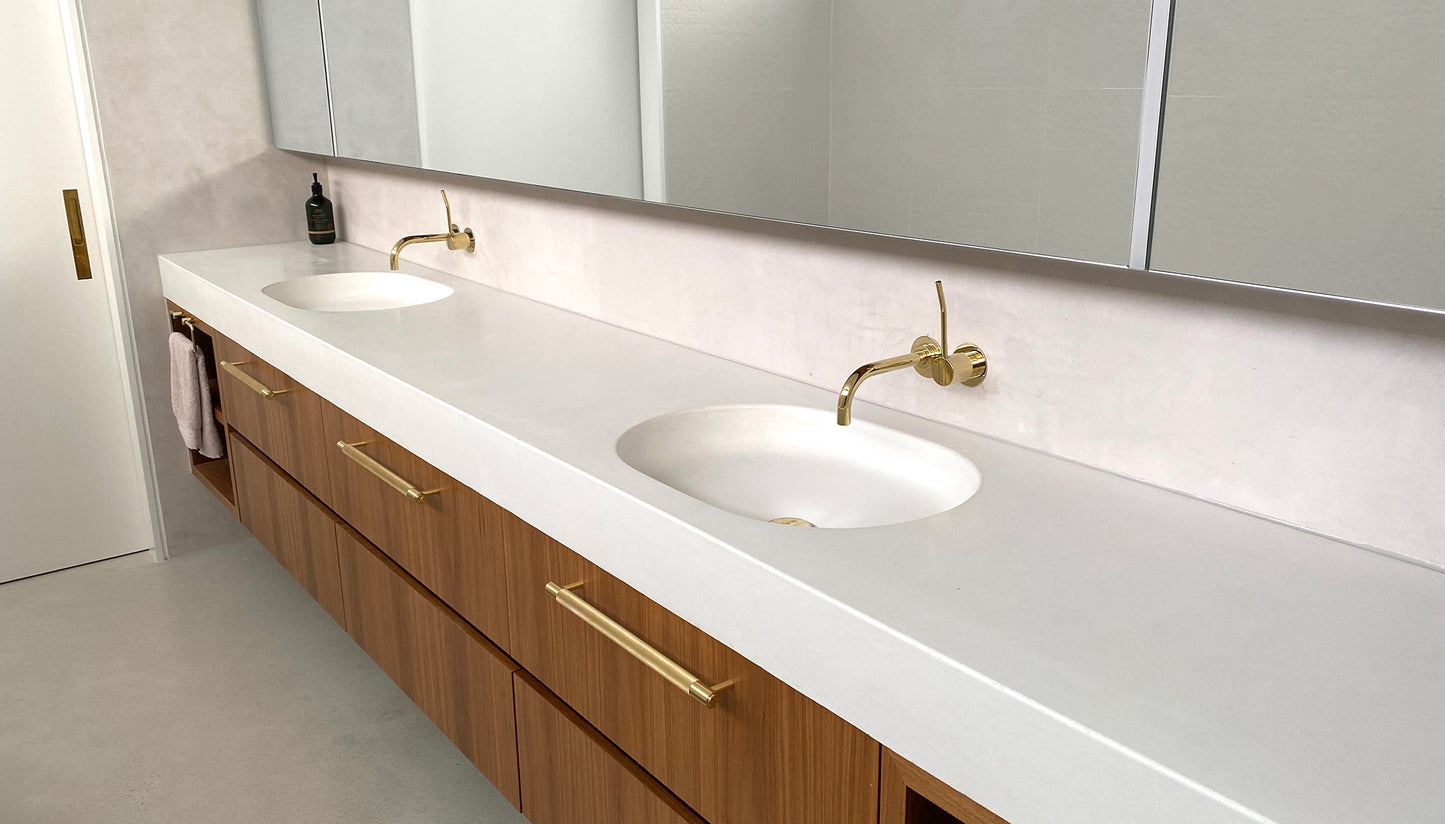 This vanity top features two seamlessly cast-in oblong basins. Available in 1,800 mm to 2,100 mm, the Kaarla Double Vanity offers a generous and elegant solution for larger bathroom spaces.