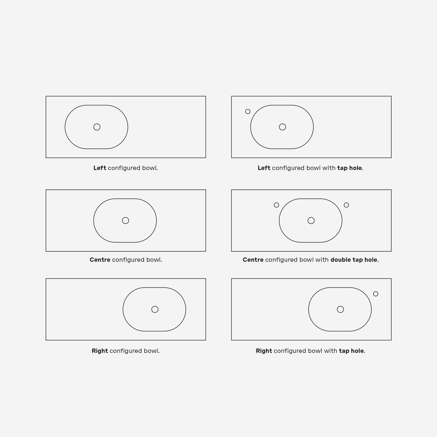 Please note: left and right bowl positions are only available on the 1,200 mm (48") vanity.